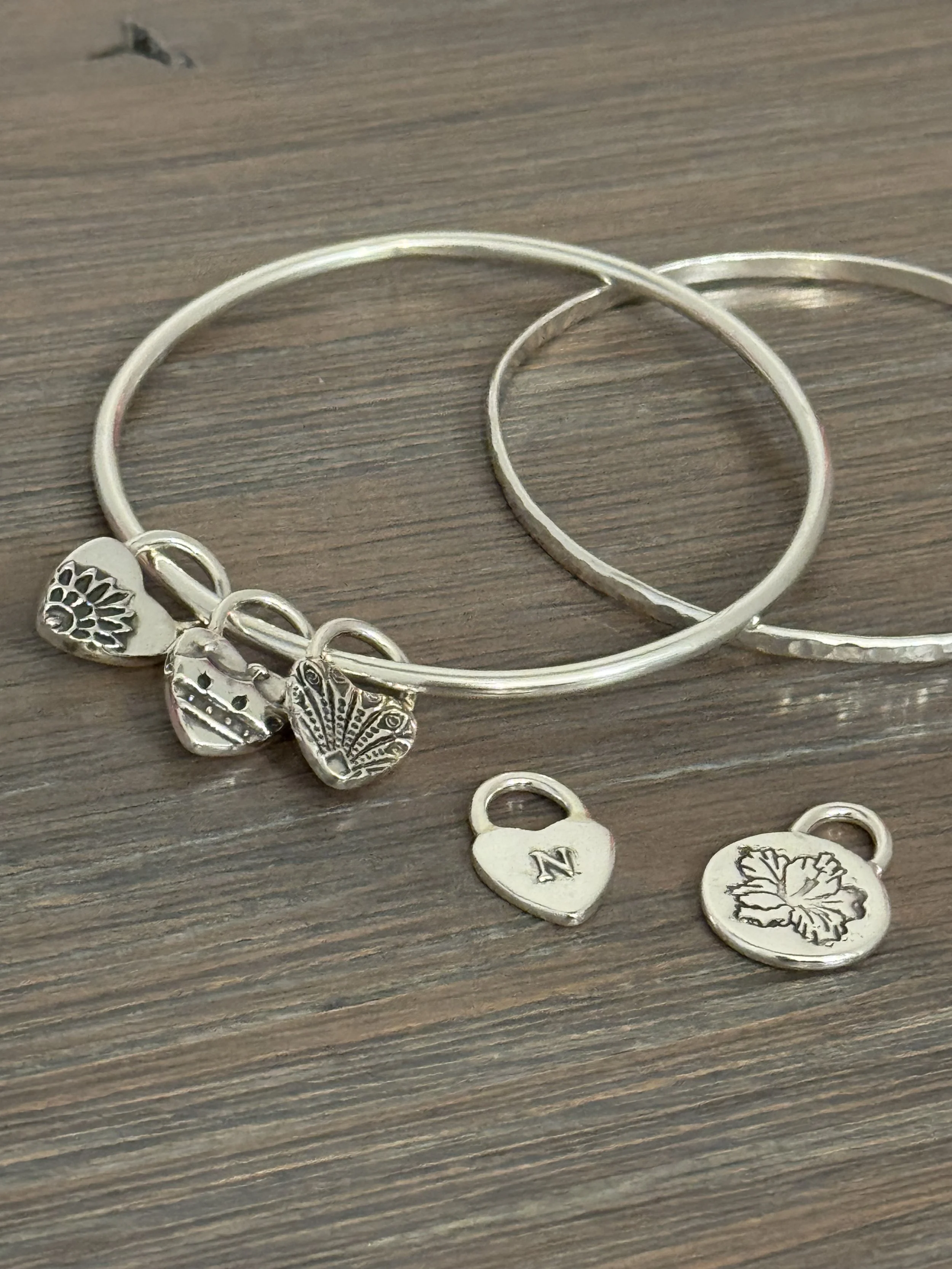 During this 4 hour class you will learn to create a sterling silver bangle and a heart or birth flower charm to add to it. You will learn how to solder silver, form, finish your bracelet, create and add your charm. The bangle and one charm is included in the cost of this class. If you would like to make additional charms please add them to your cart. This makes a wonderful mother’s bracelet or memorable Mother’s Day experience. Snacks and refreshments will be provided. In the form, please indicate in the message if this bracelet is for you or a gift. Measurements will be needed if this is a gift.